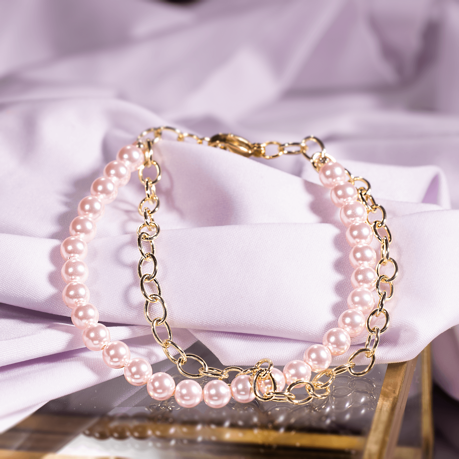 Rokas ķēdīte ar gaiši rozā pērļu virteni